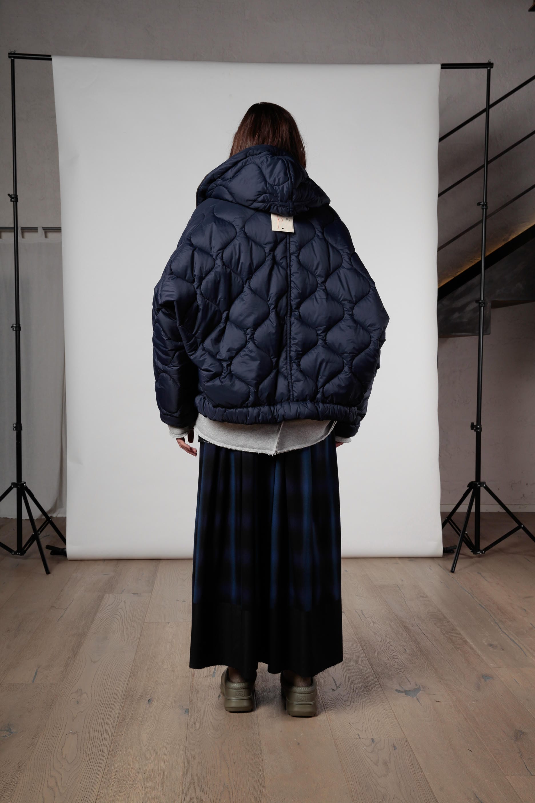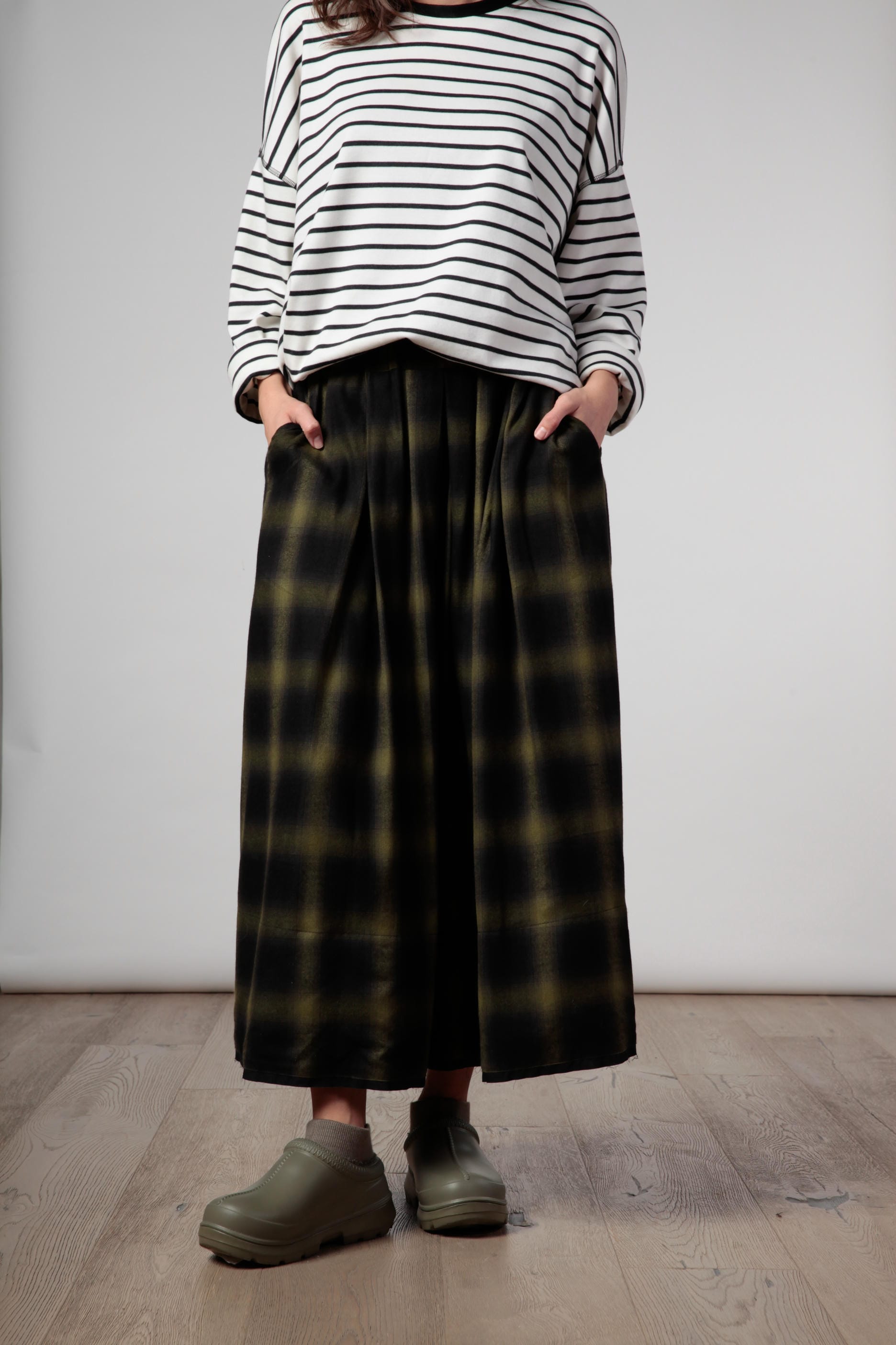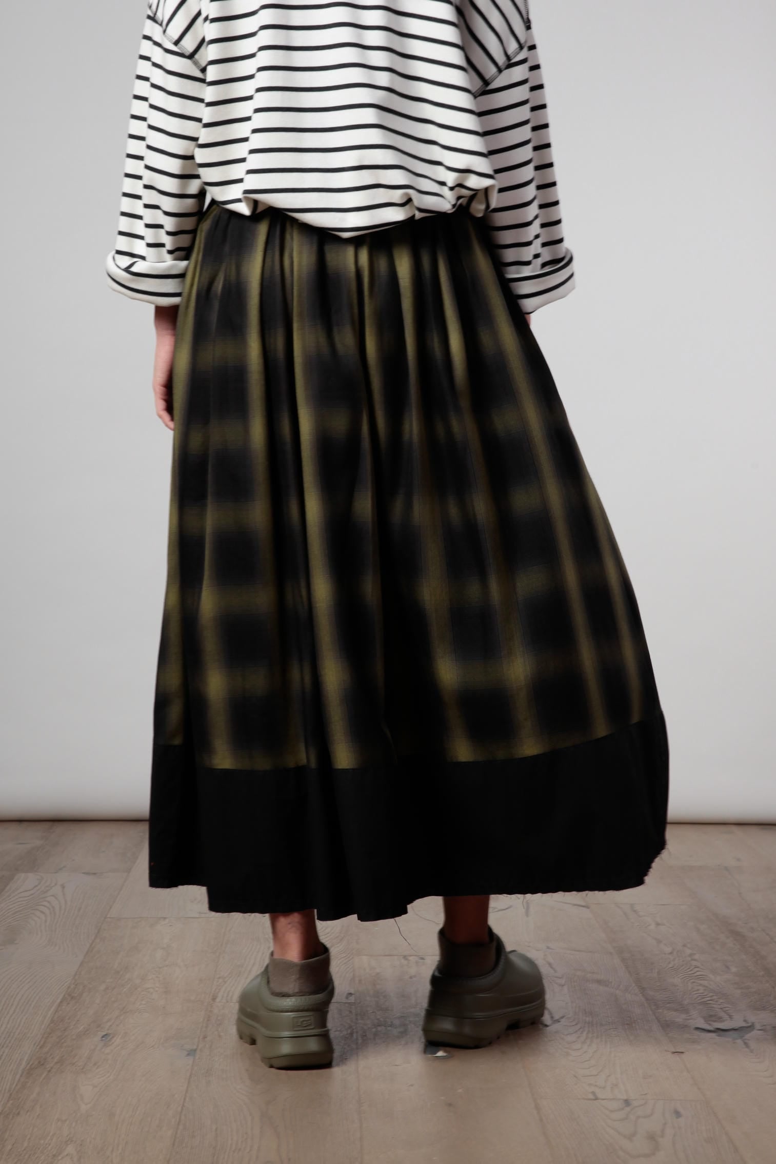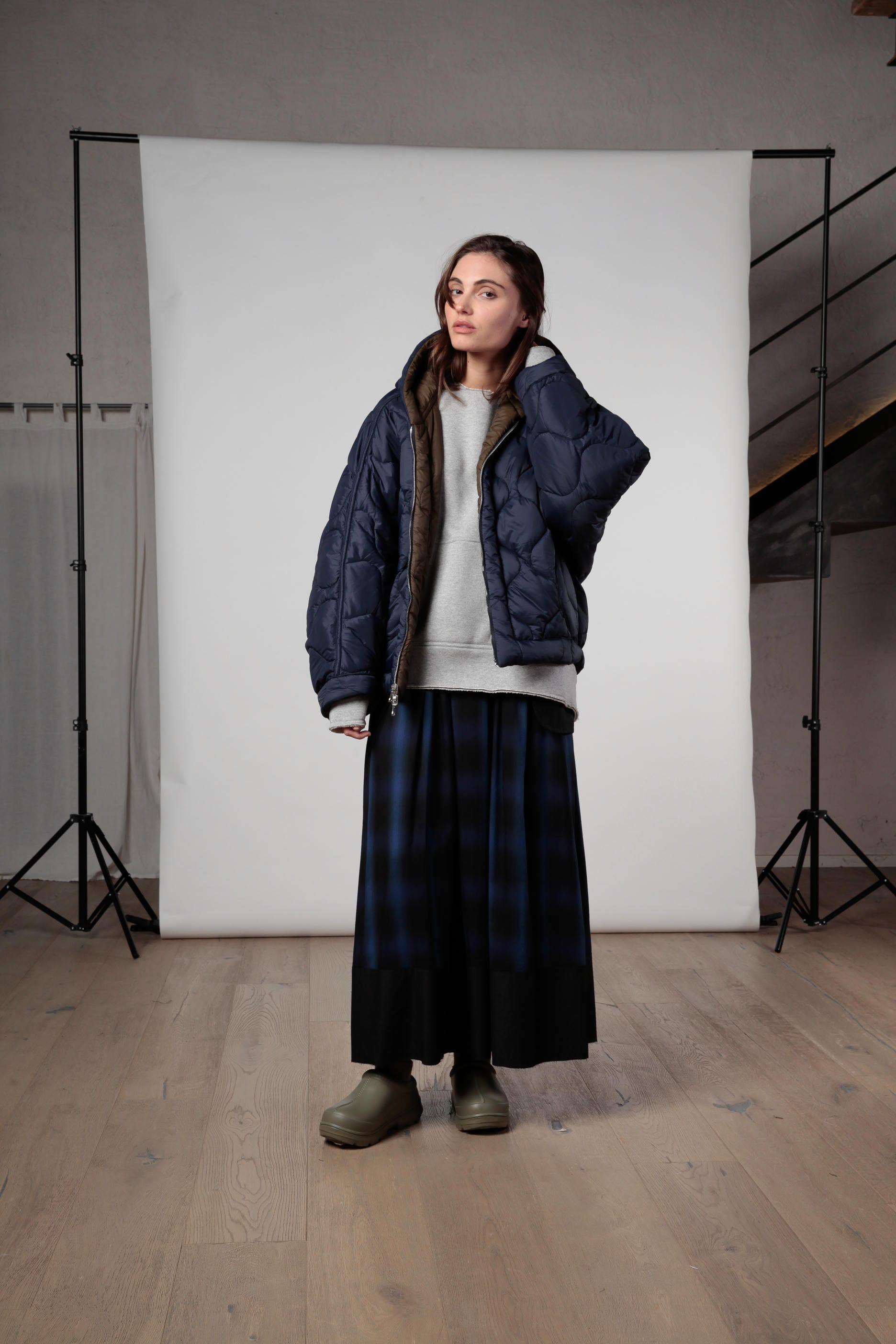 Re:pose è una gonna in tessuto check autunnale, con elastico in vita per una vestibilità rilassata. Double face con tasche doppie — interne ed esterne — in contrasto. Bordata internamente e rifinita con fondo a vivo in popeline di cotone. Un capo funzionale e trasformabile, pensato per stratificazioni e uso quotidiano.