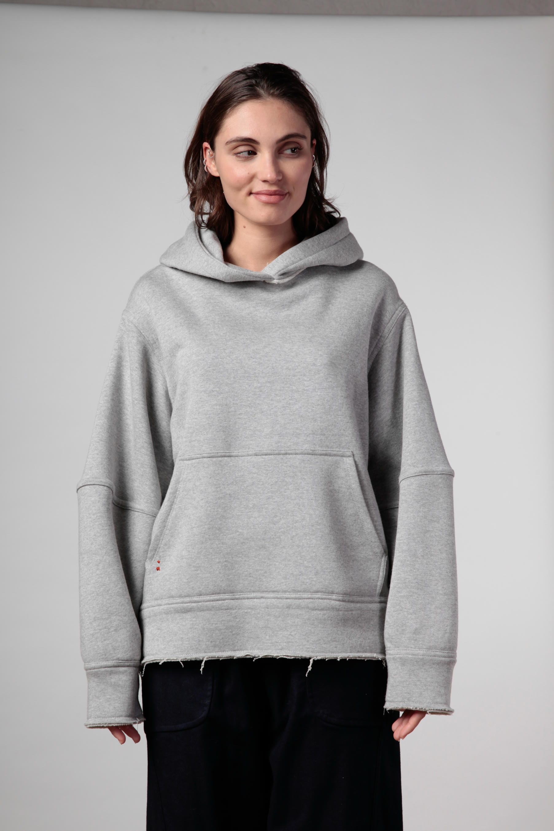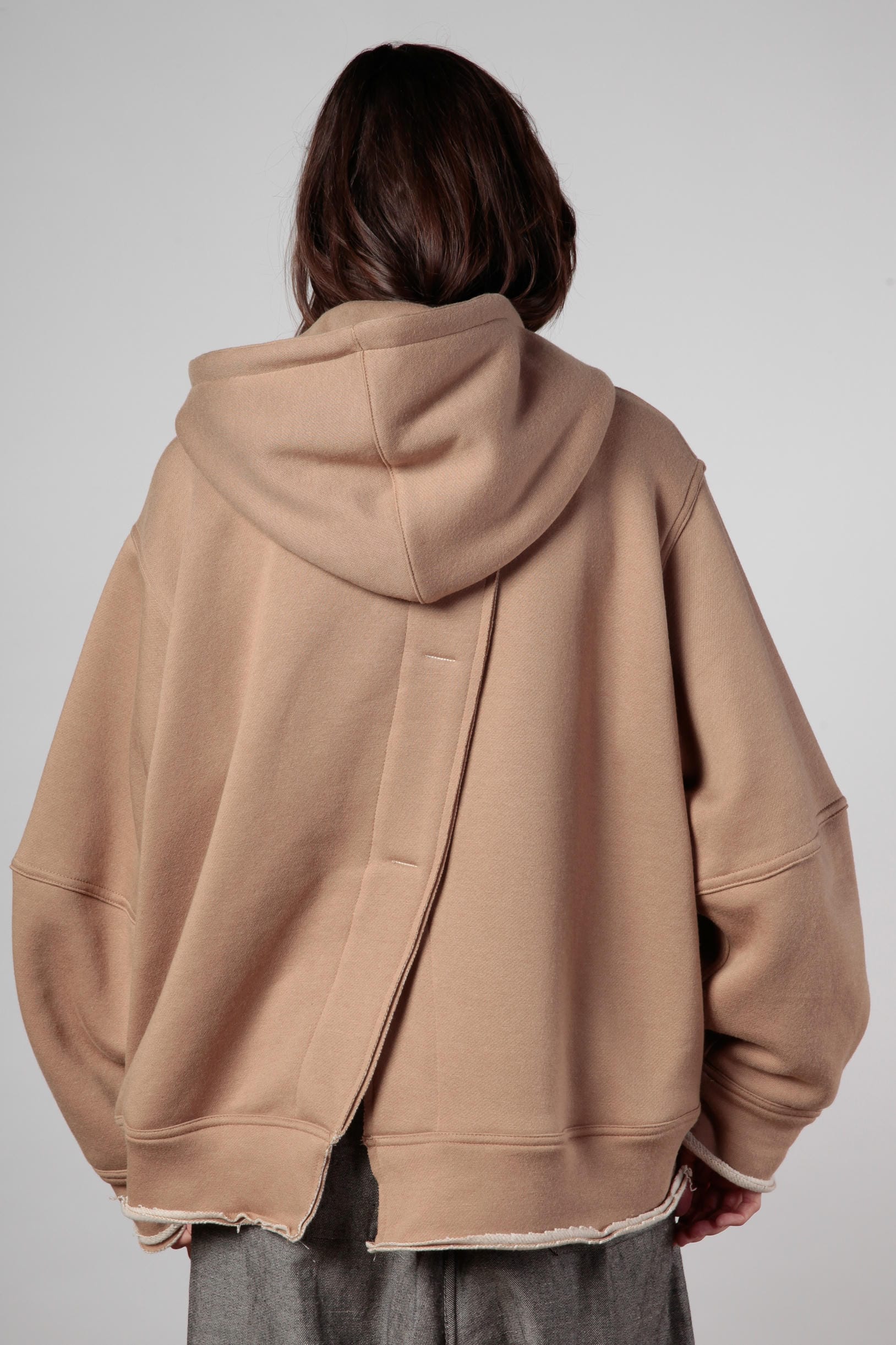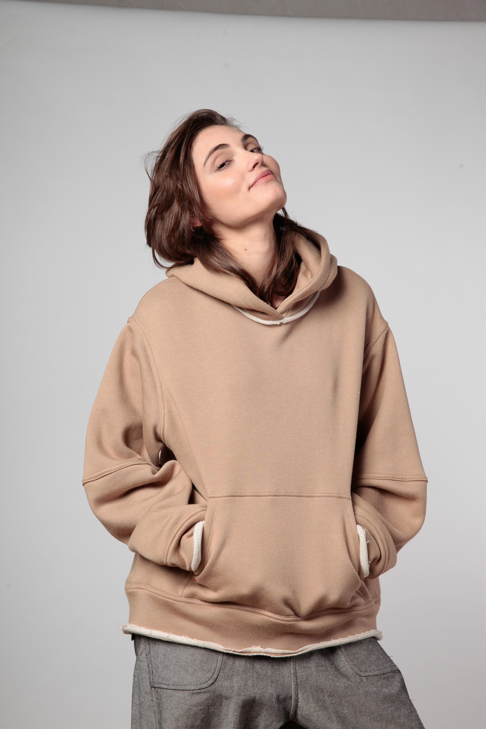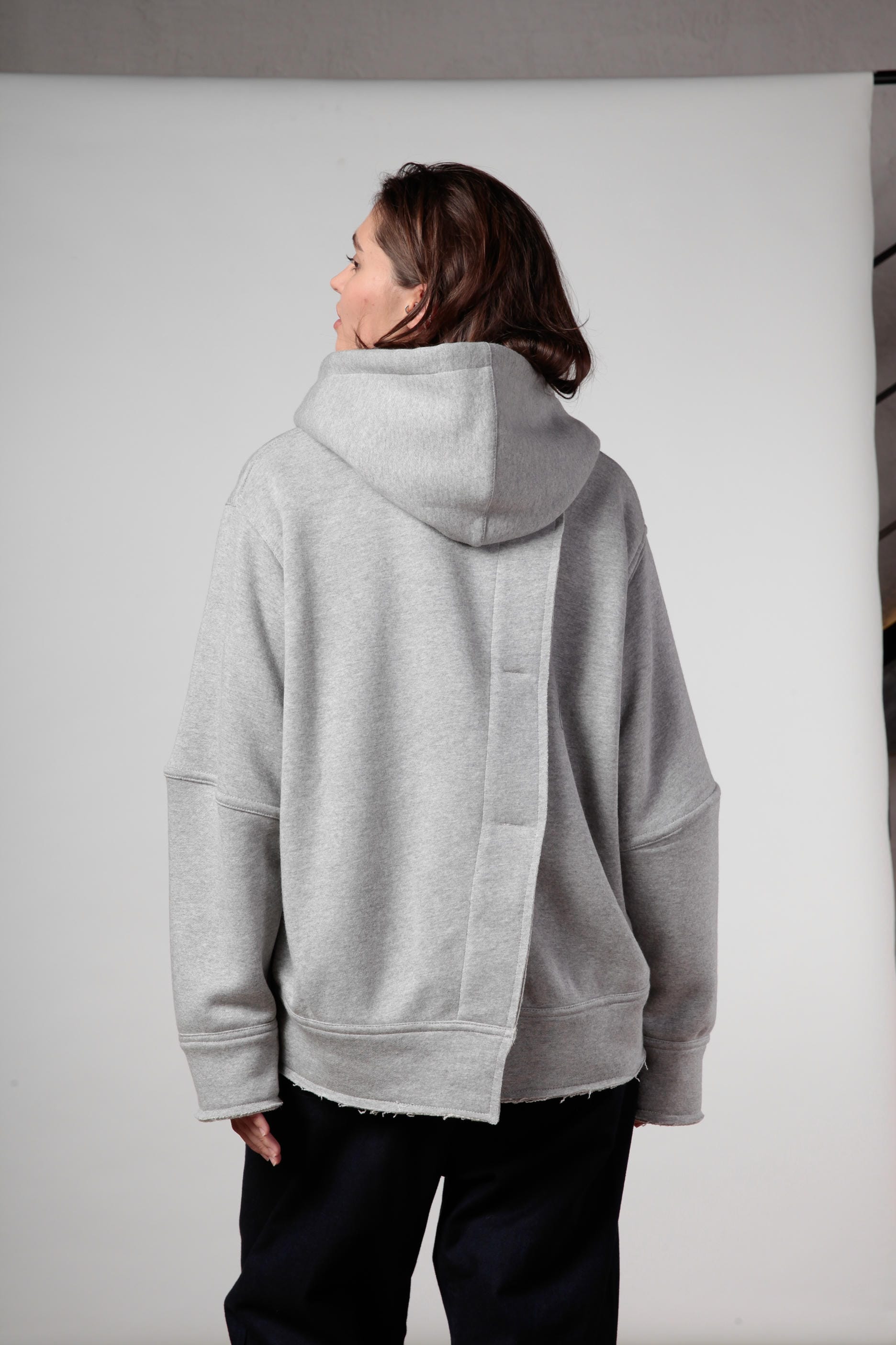 Reform è una felpa over double con cappuccio in cotone e lana , costruita con finiture a taglio vivo. Volume strutturato e silhouette architettonica, con apertura diagonale sulla schiena e travette tono su tono come dettagli funzionali. Un capo ibrido e trasformabile, pensato per stratificazioni e layering urbano.