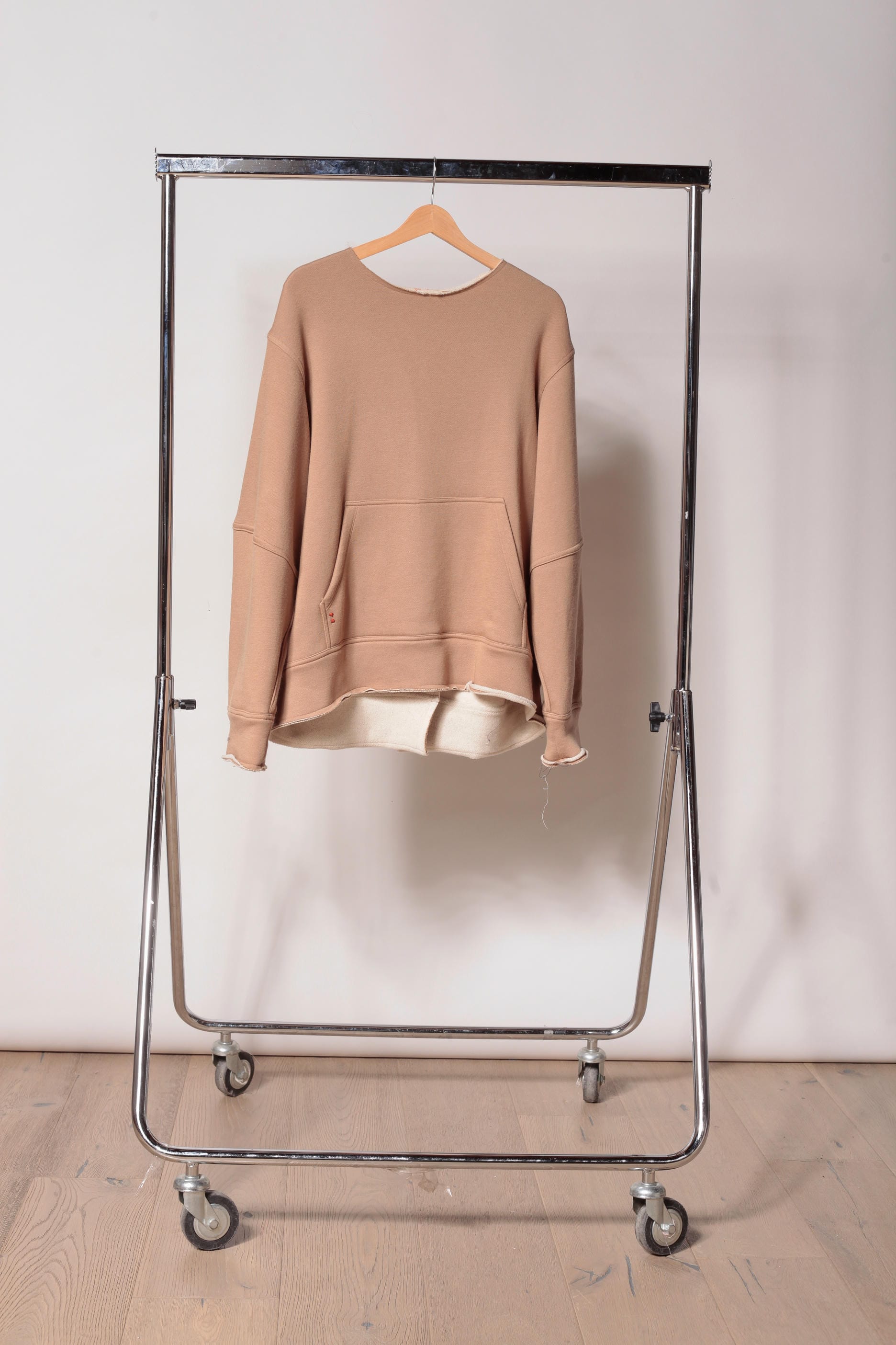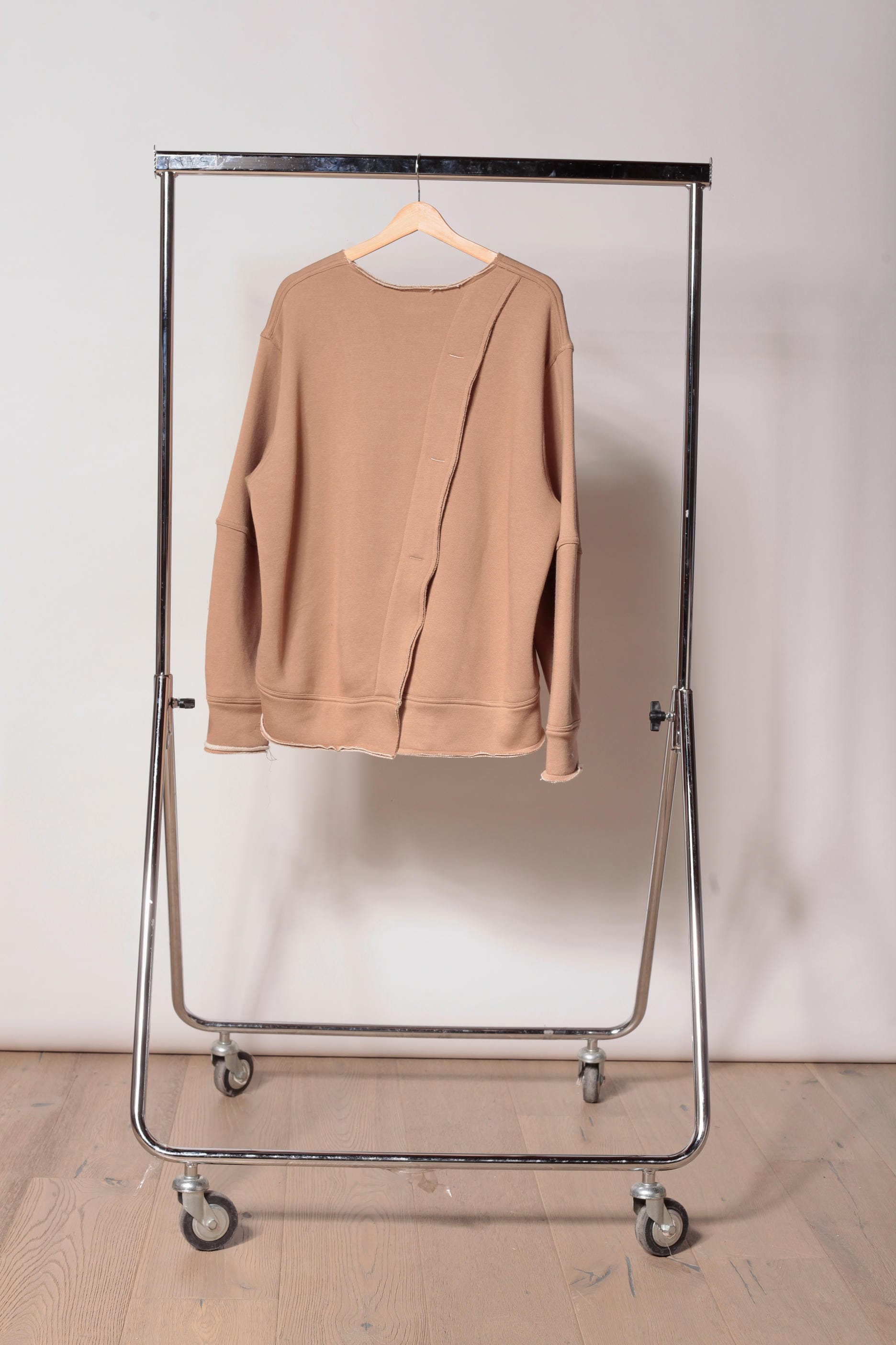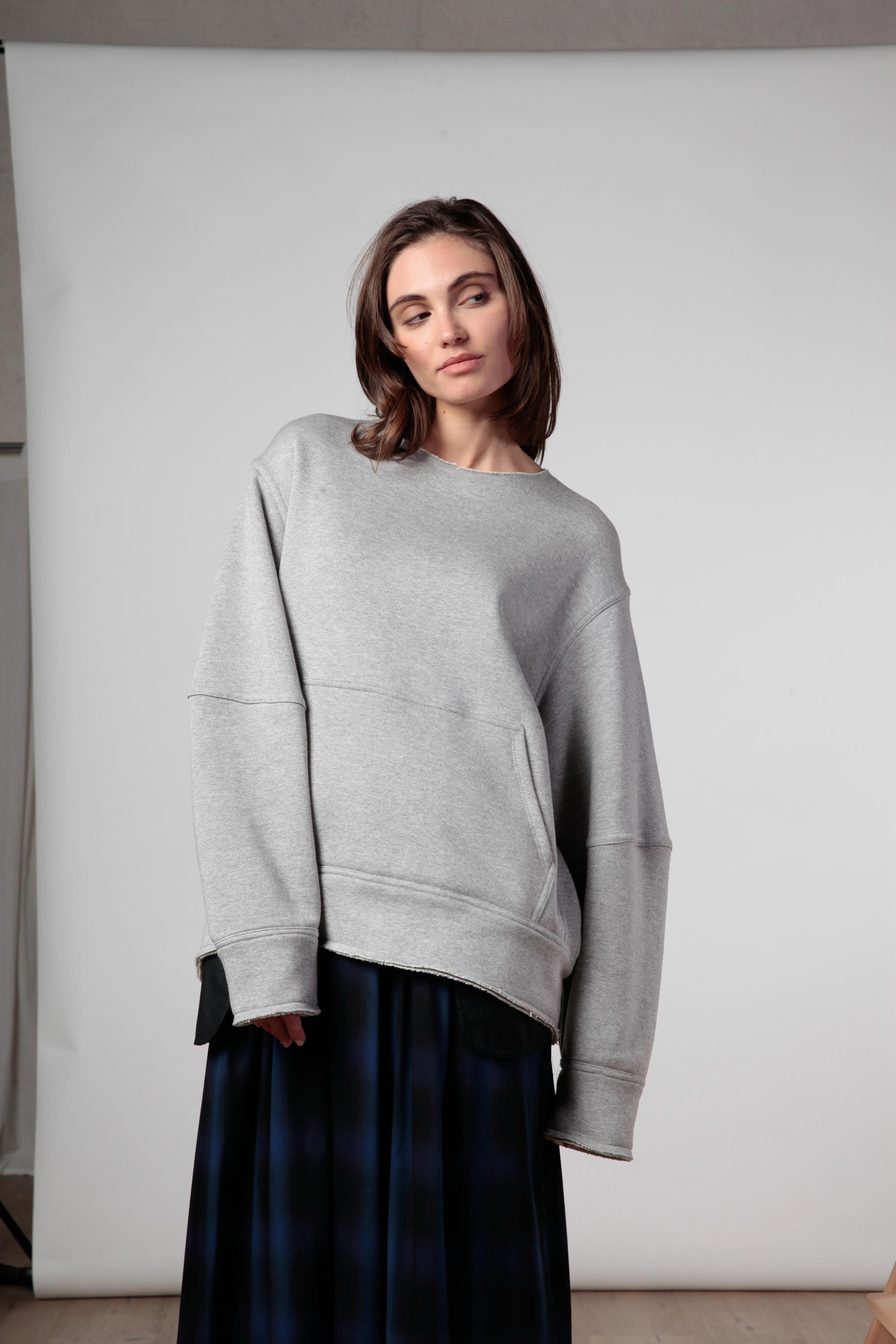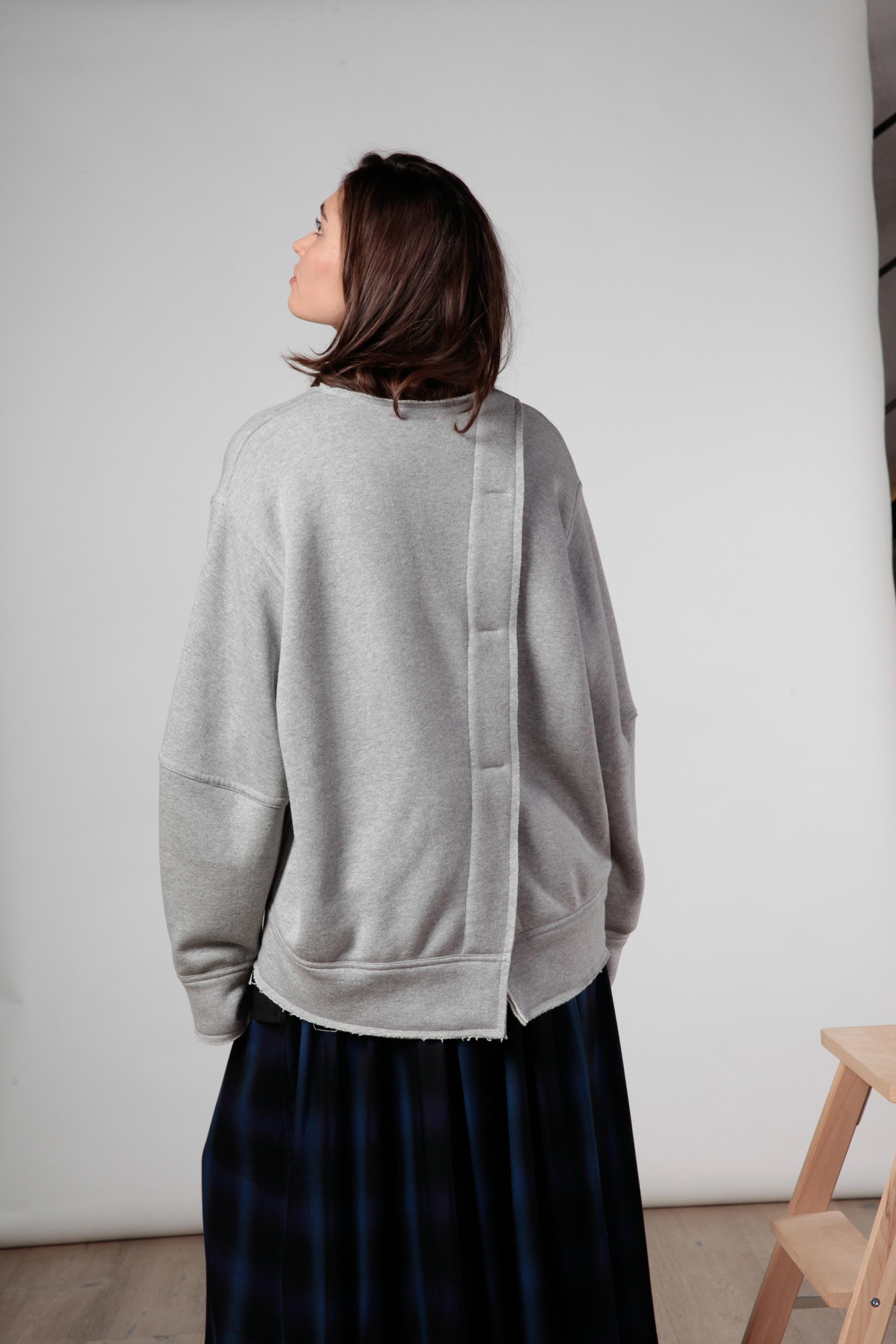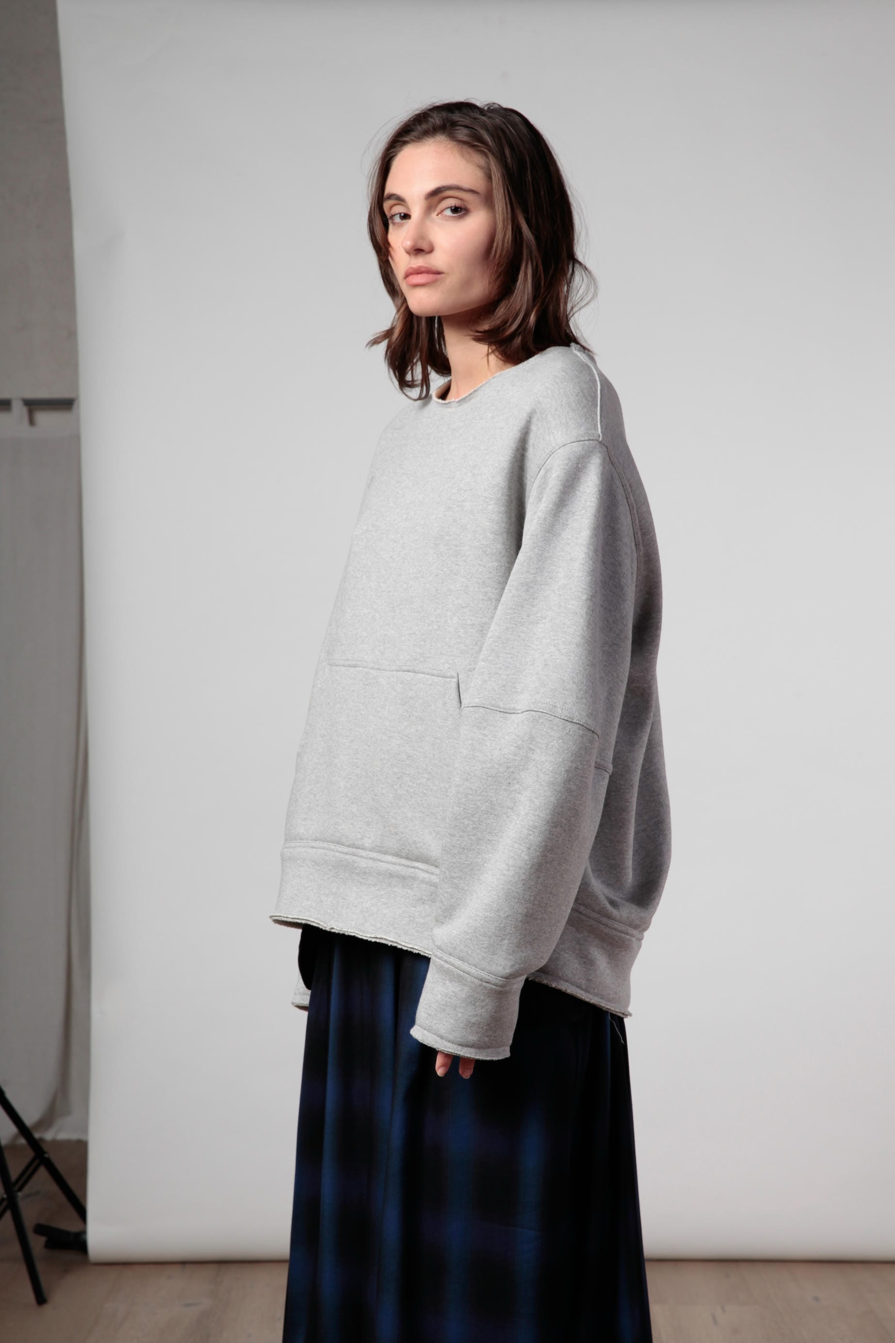 Reform è una felpa over double girocollo in cotone e lana , costruita con finiture a taglio vivo. Volume strutturato e silhouette architettonica, con apertura diagonale sulla schiena e travette tono su tono come dettagli funzionali. Un capo ibrido e trasformabile, pensato per stratificazioni e layering urbano.