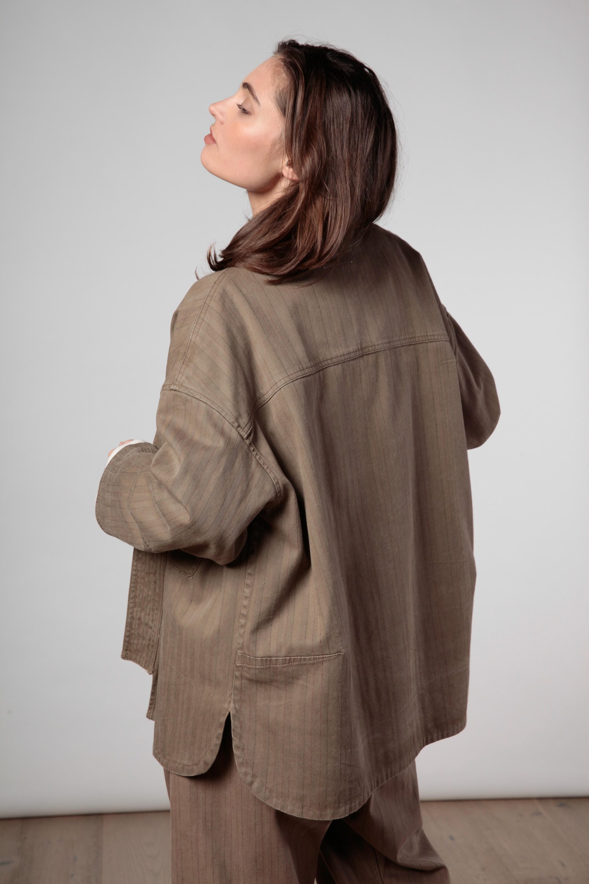Kimono-camicia in cotone gessato con trattamento stone per una texture vissuta e materica. Struttura reversibile con finta impuntura e tasche frontali applicate. Volume fluido e costruzione destrutturata, pensata per un uso trasversale tra camicia e giacca. Un capo ibrido e trasformabile, ideale per layering e sovrapposizioni.