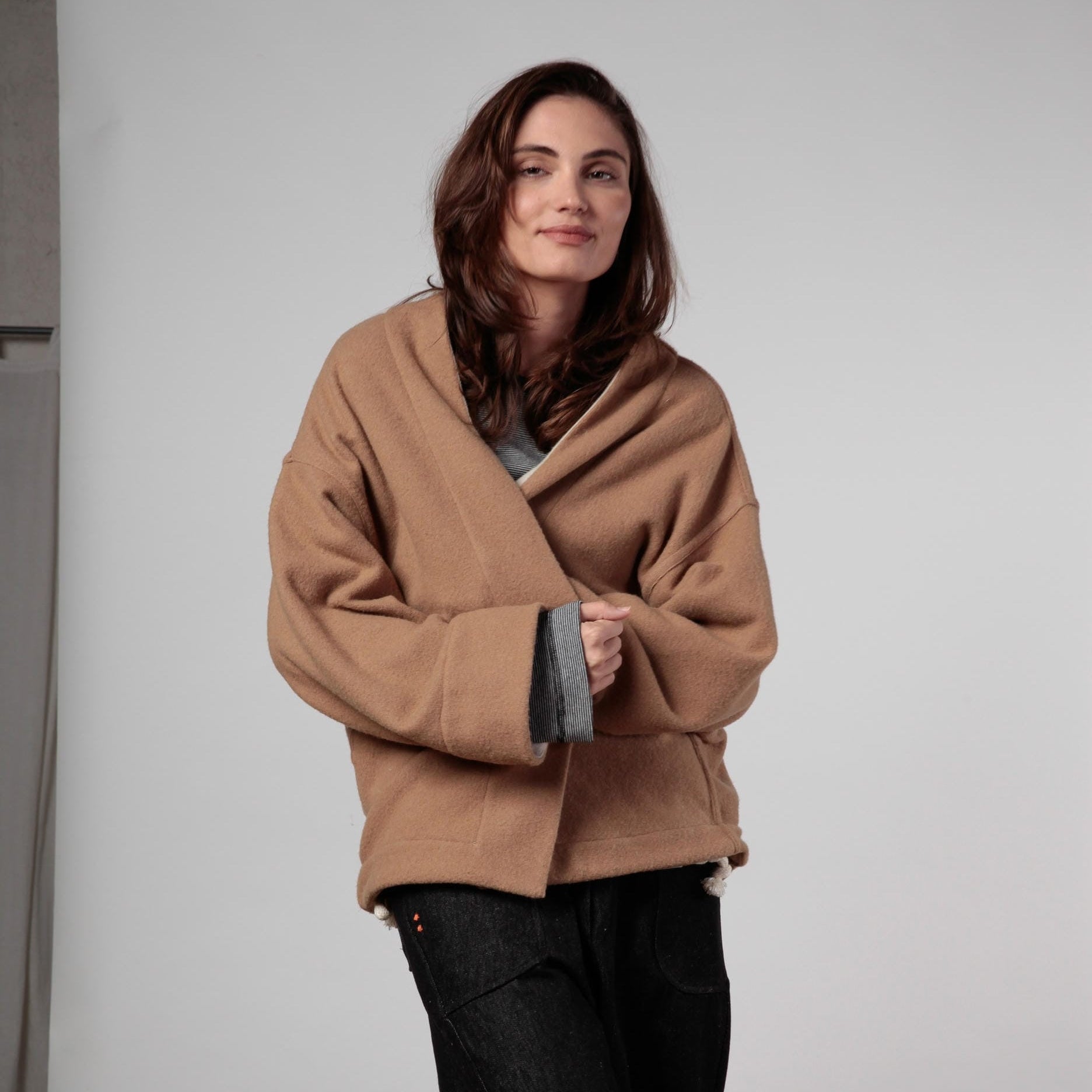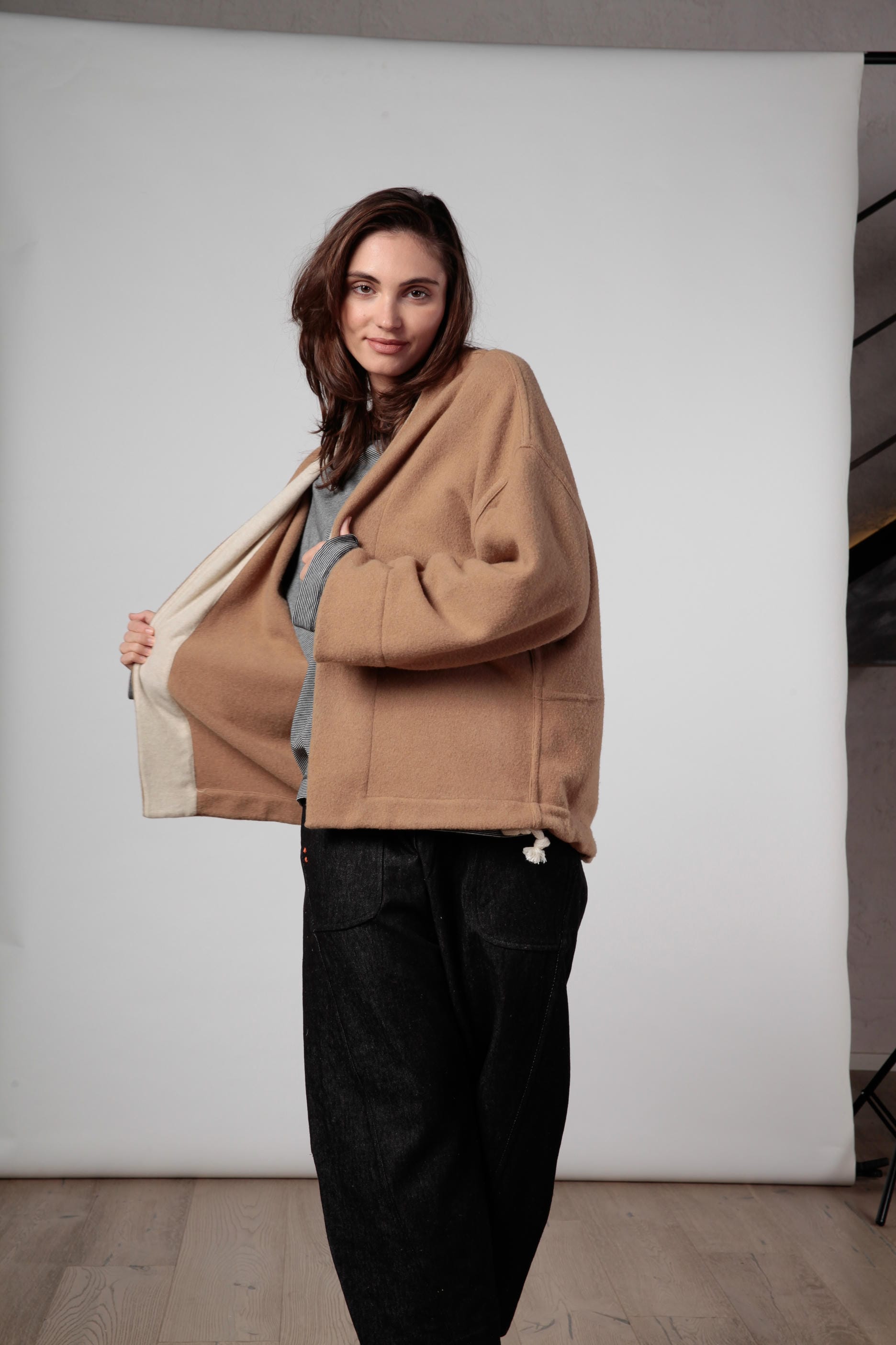 Re:iki Kimono over in misto cachemire, double face con coulisse posteriore per modulare il volume. Interno rifinito con bordi a contrasto. Struttura fluida e architettonica, pensata per un uso versatile e trasformabile.
