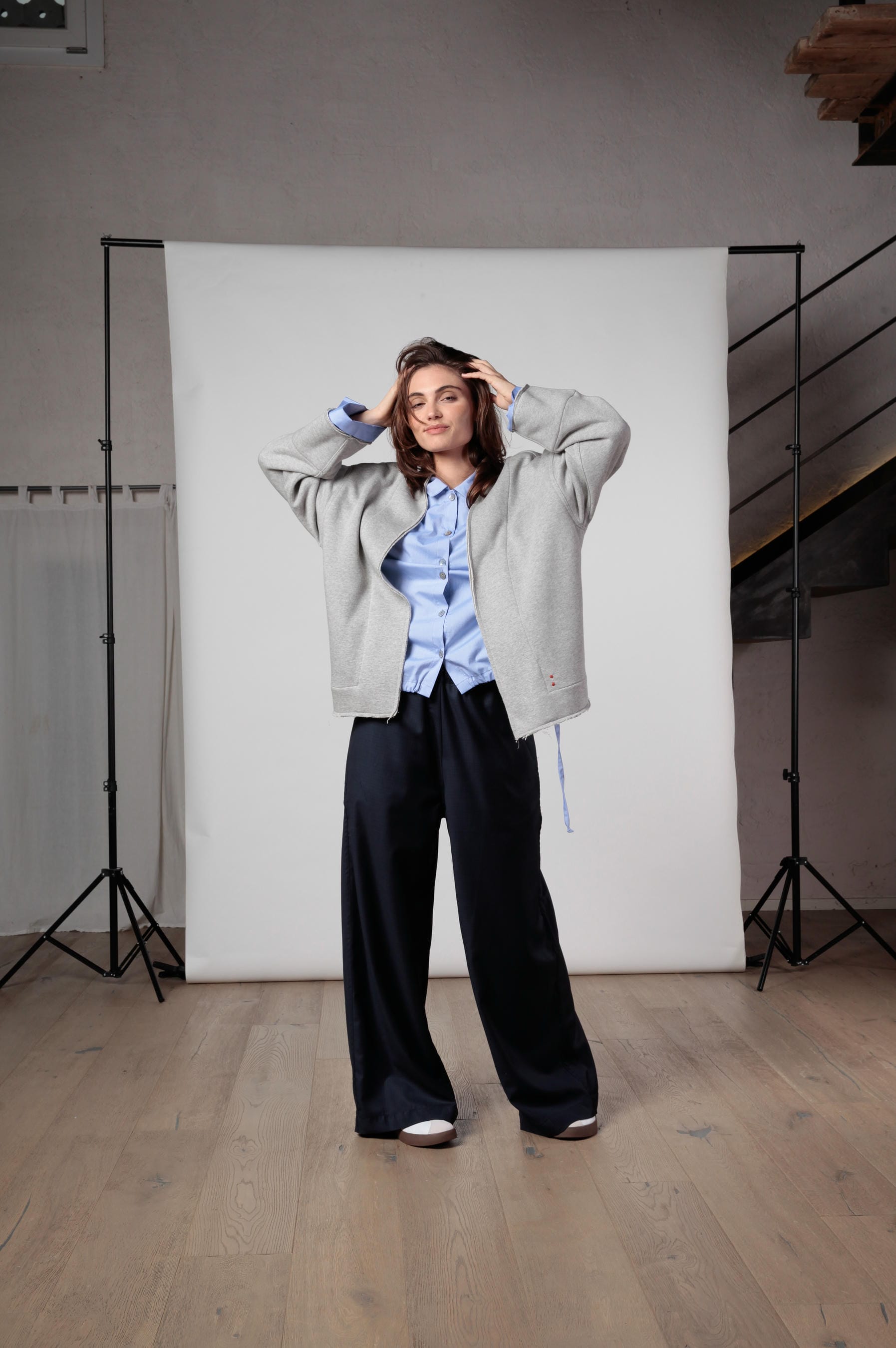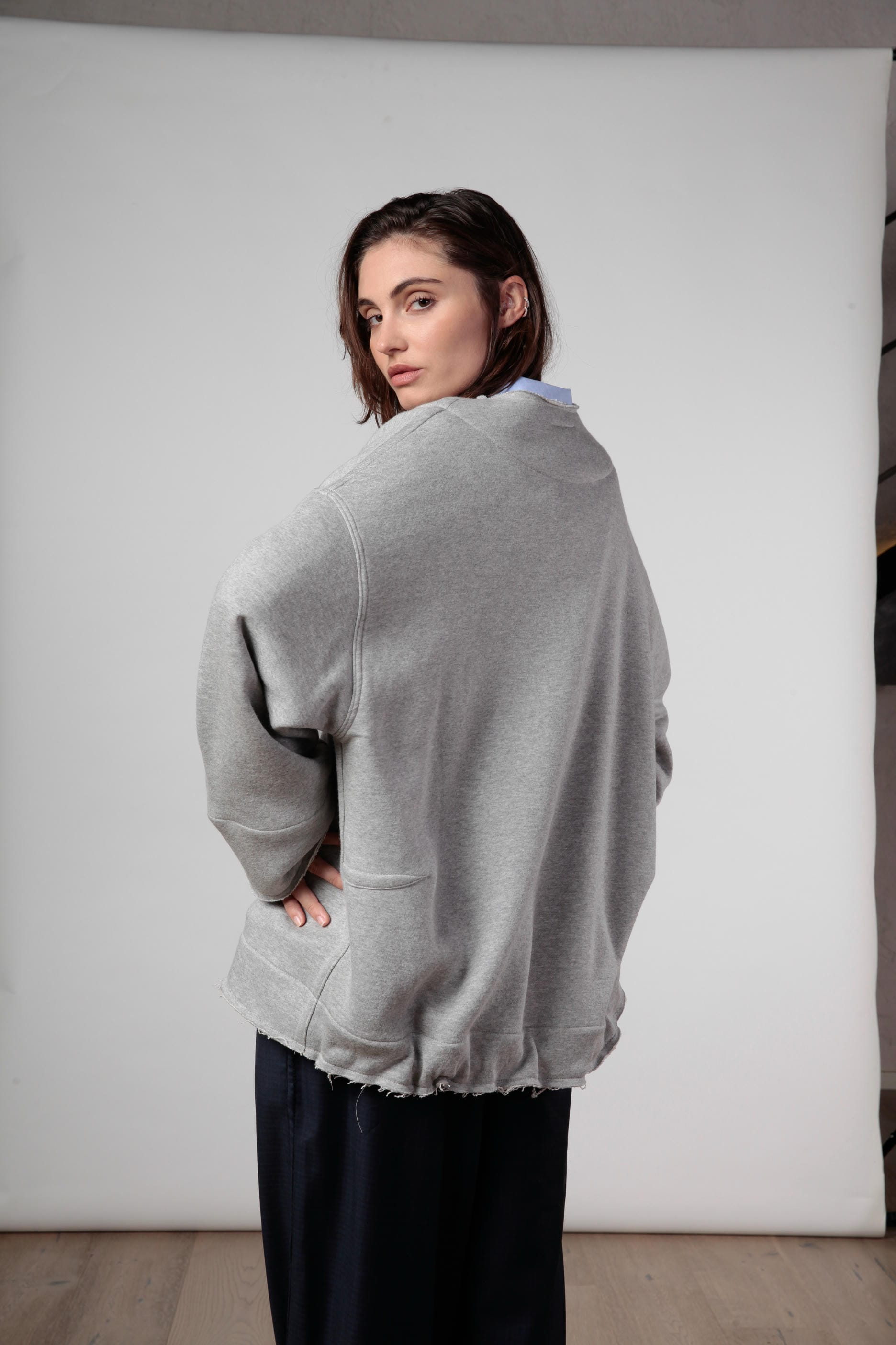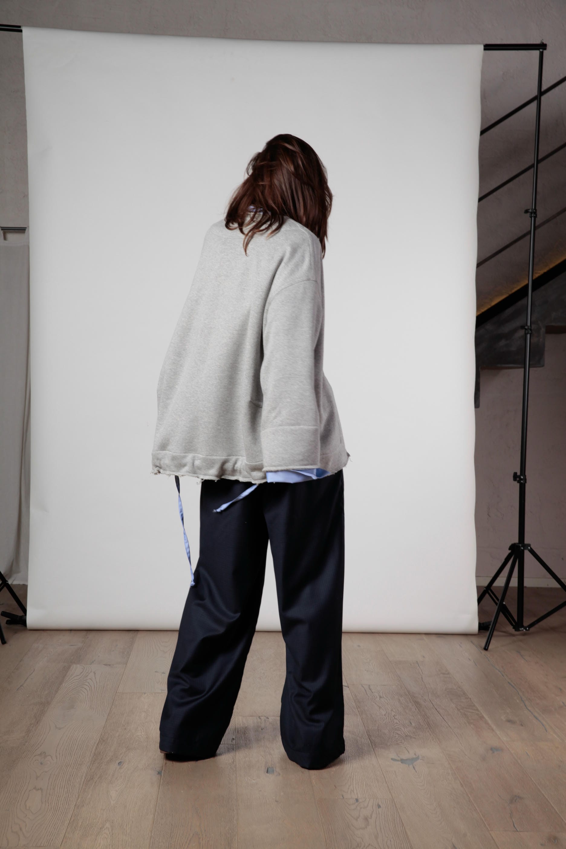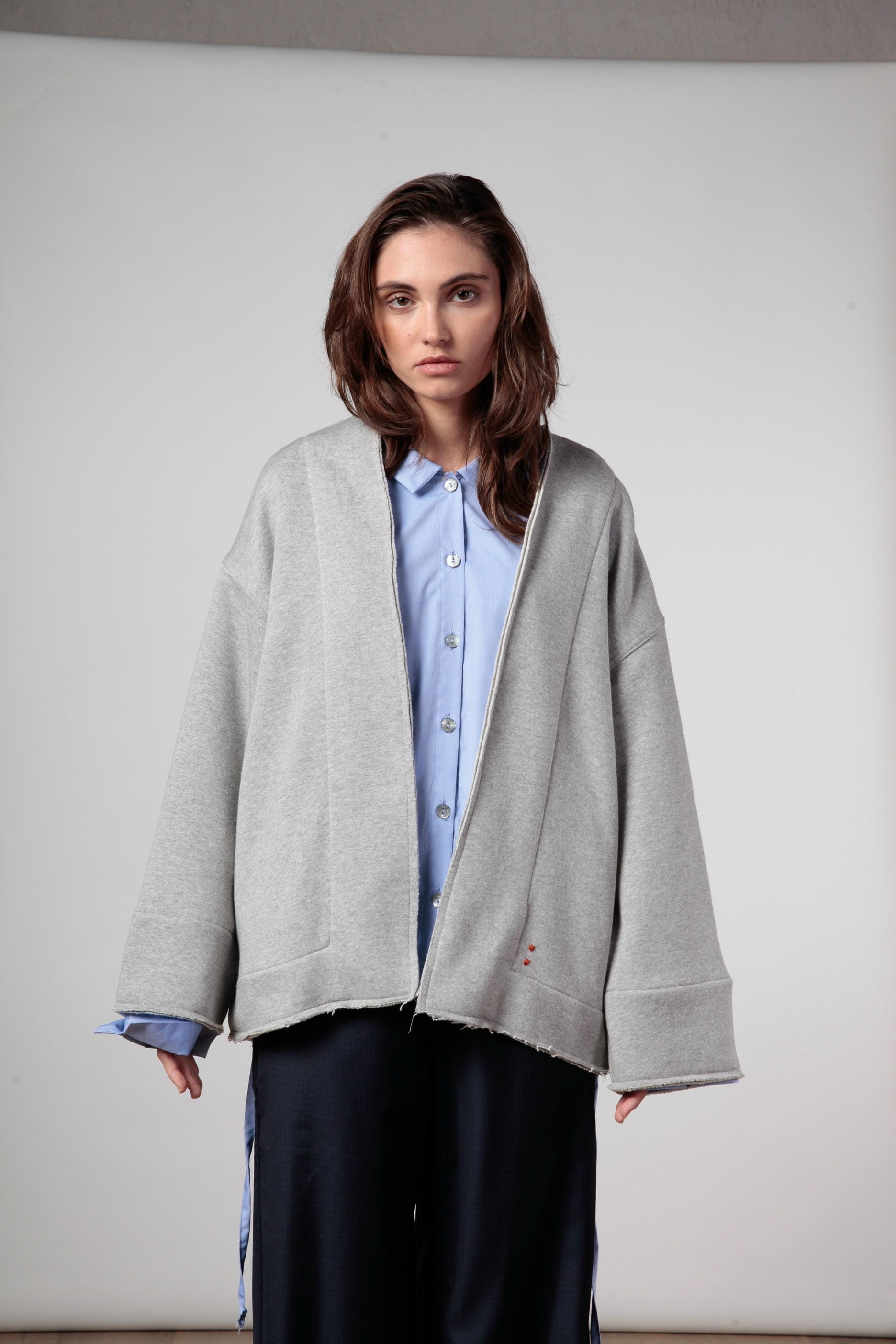 Re:iki Kimono over in Felpa di cotone e lana double face con coulisse posteriore per modulare il volume rifinito con bordi a taglio vivo. Struttura fluida e architettonica, pensata per un uso versatile e trasformabile.
