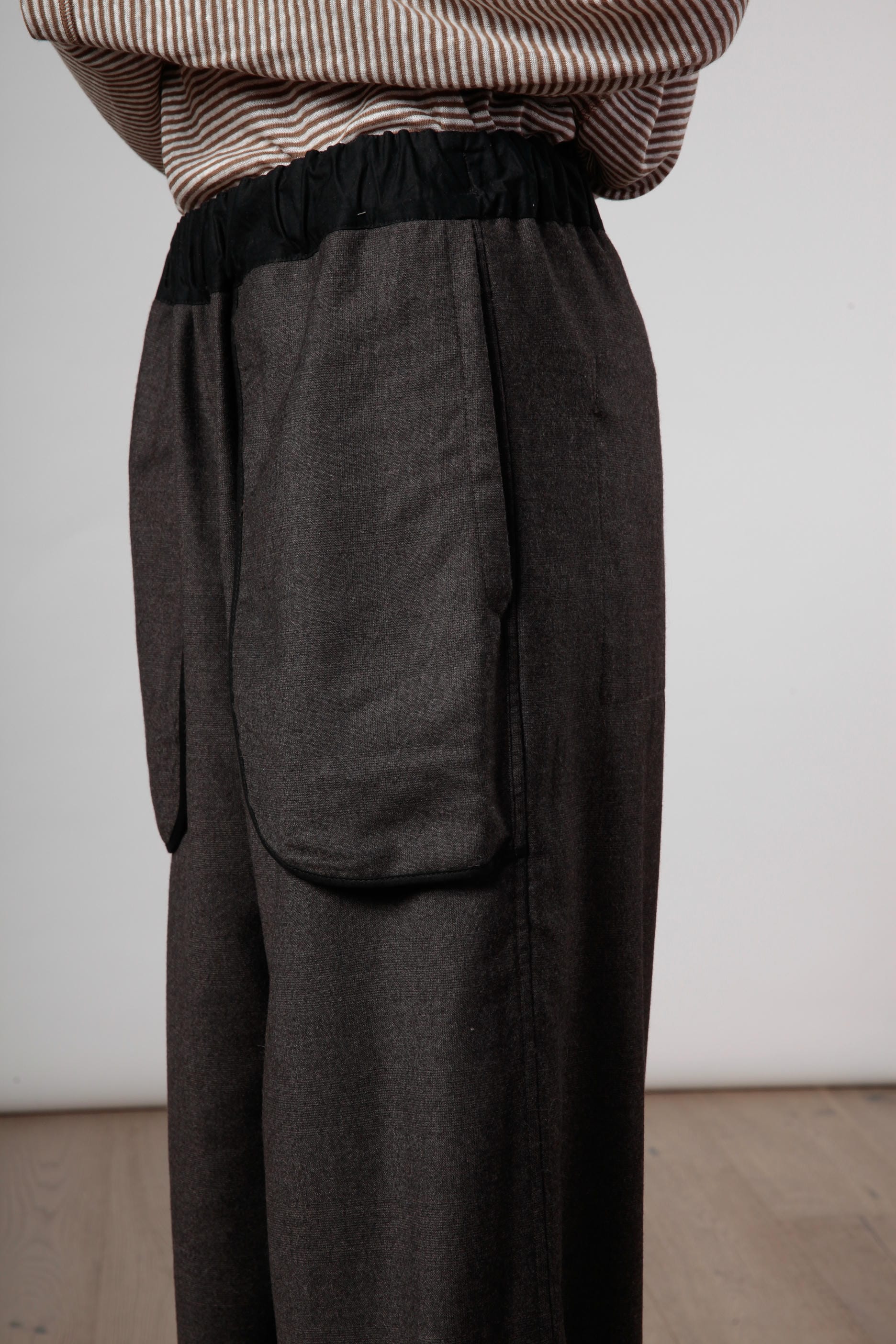 Re:lax Pantalone a palazzo in fresco di lana, double face con due identità: un lato essenziale e sobrio, l’altro caratterizzato da doppie tasche e fascione bordato in cotone nero. Volume ampio e costruzione fluida per un capo versatile e trasformabile.