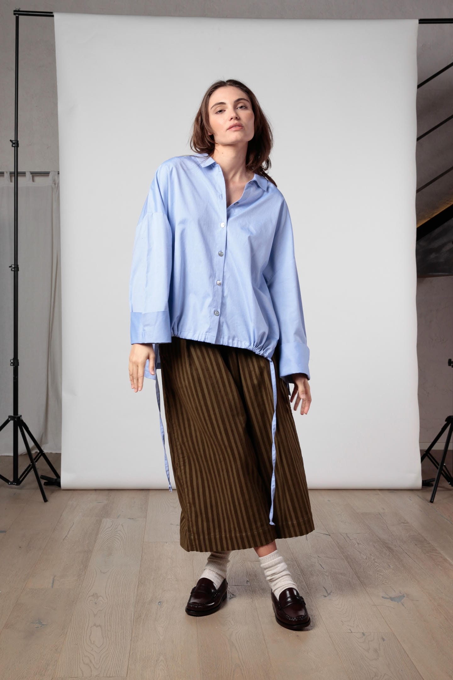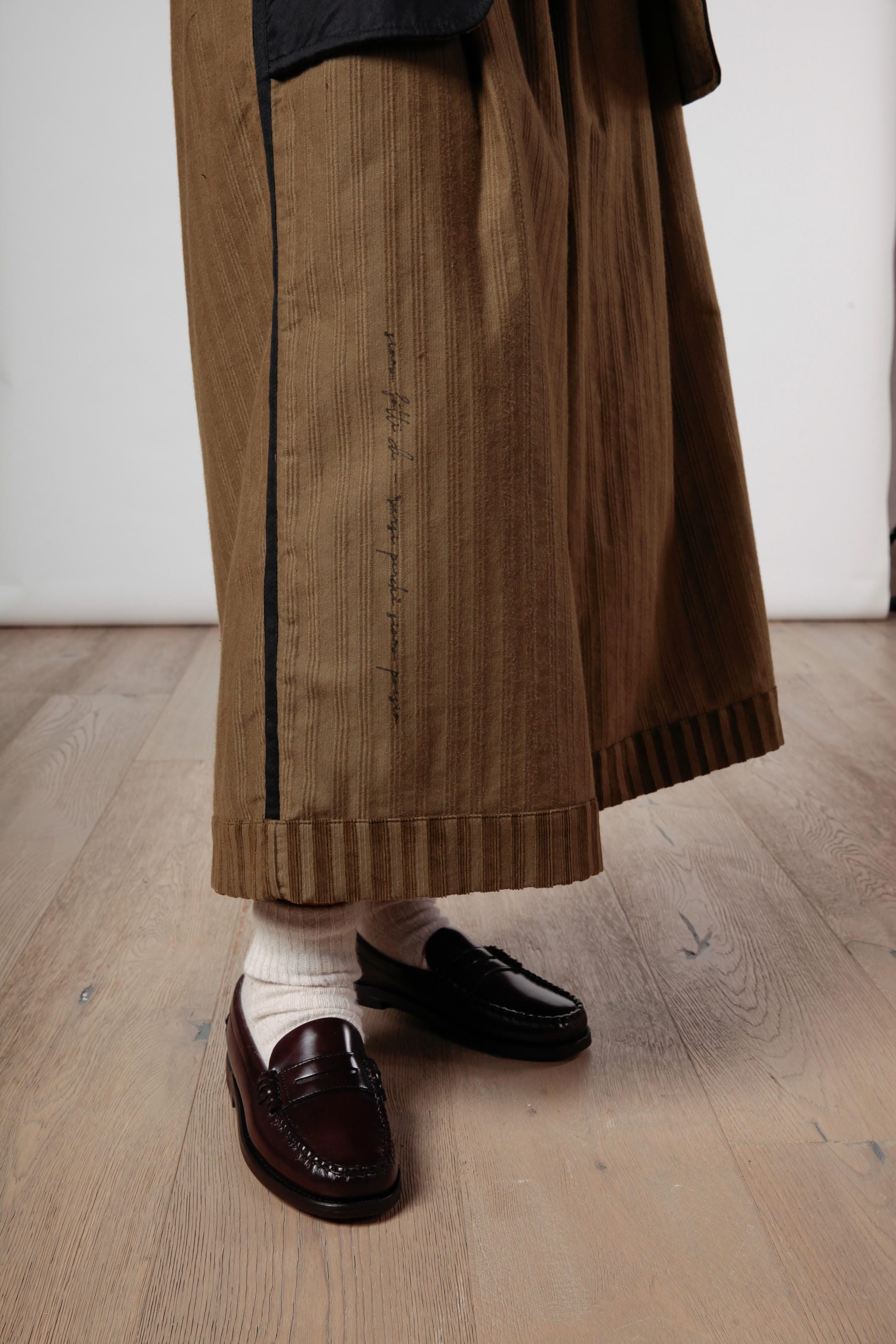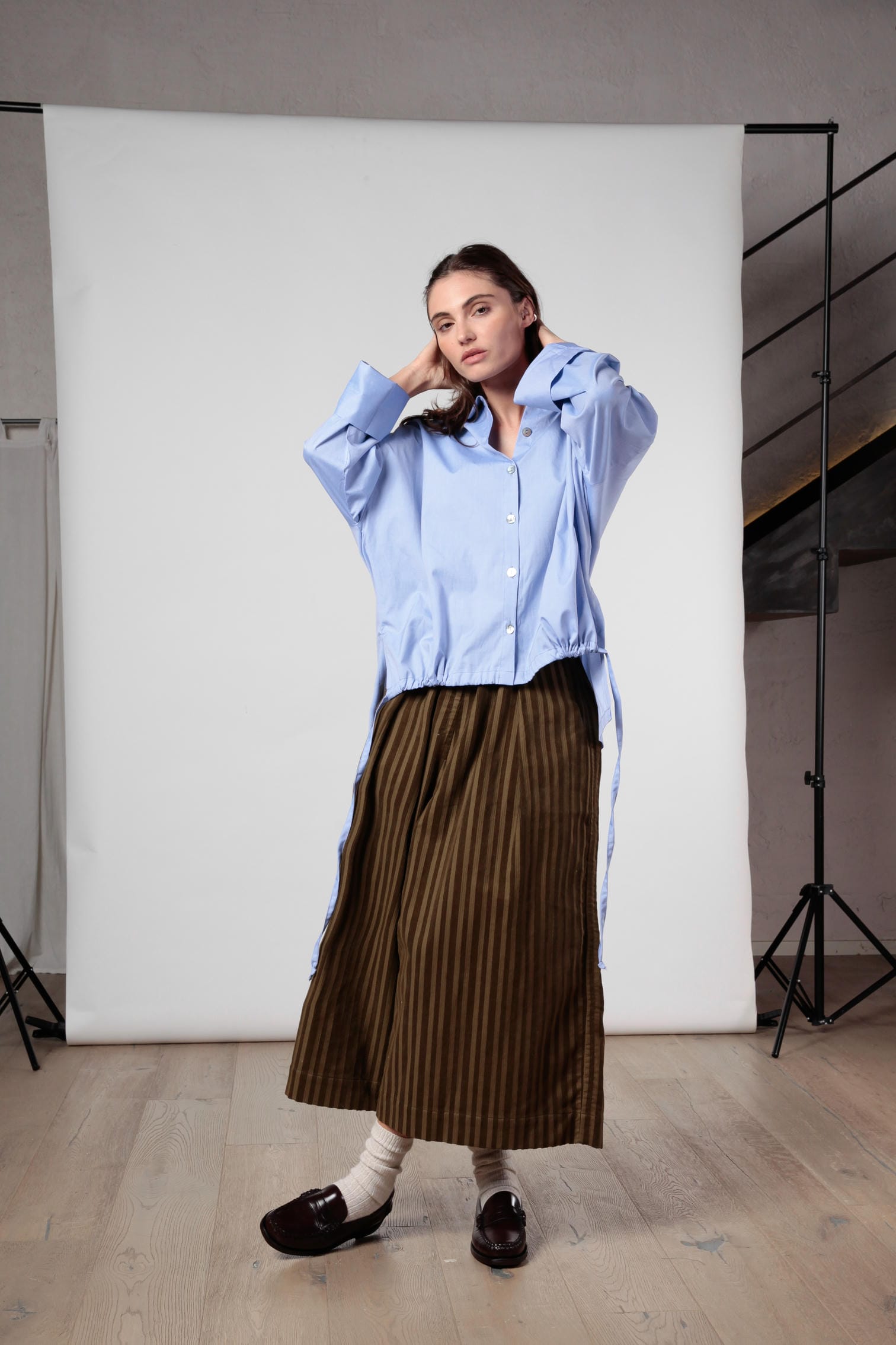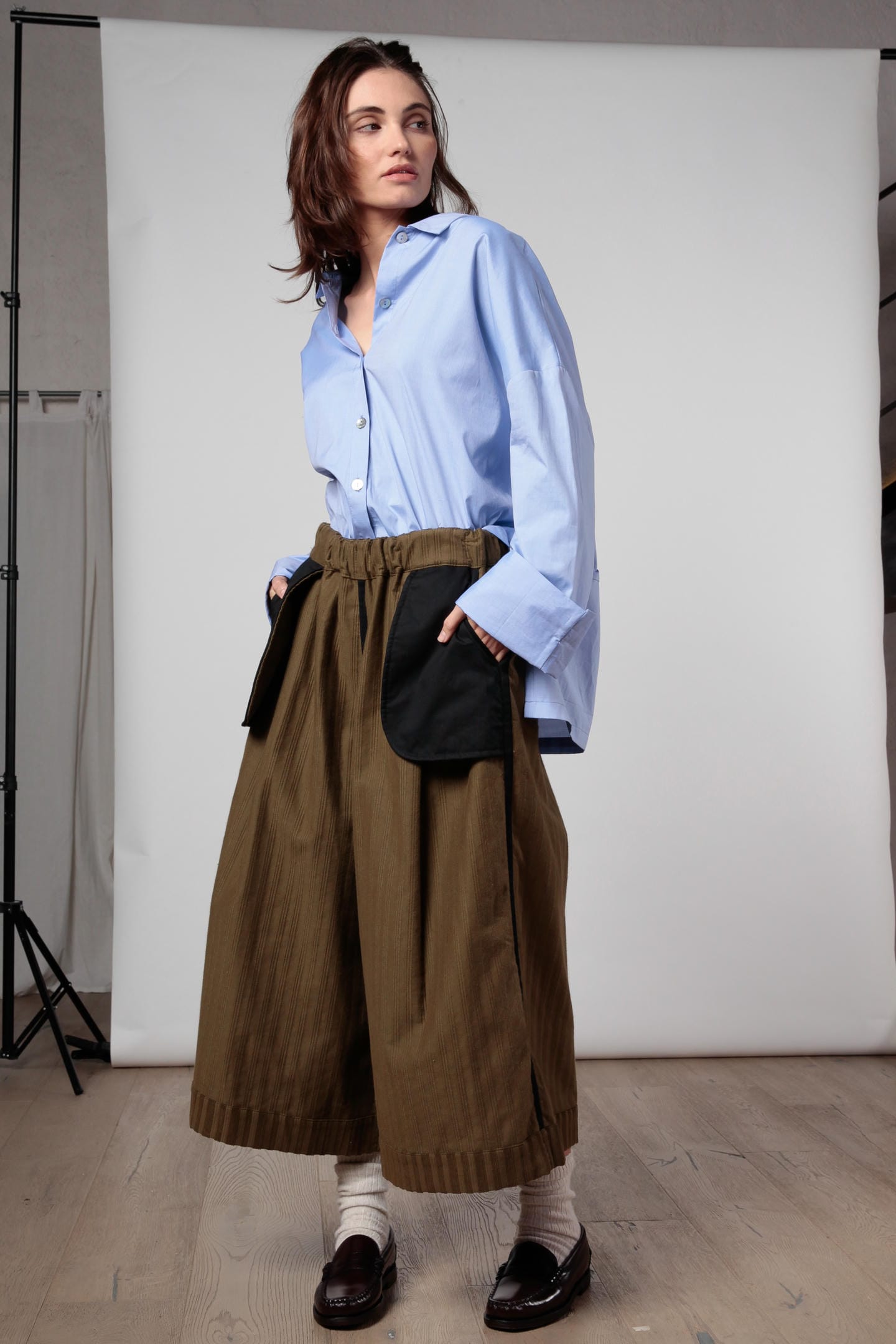 Re:cord è una Pantagonna in velluto di cotone a coste larghe verde militare, con struttura materica che mantiene il volume. Vita elasticizzata per una vestibilità adattiva. Costruzione reversibile con bordi e travette in contrasto in popeline di cotone nero. Un capo ibrido e architettonico, pensato per stratificazioni e silhouette dinamiche.